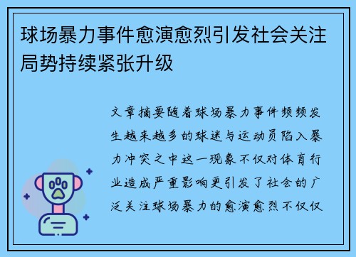 文章摘要:随着球场暴力事件频频发生,越来越多的球迷与运动员陷入暴力冲突之中,这一现象不仅对体育行业造成严重影响,更引发了社会的广泛关注。球场暴力的愈演愈烈,不仅仅是局部问题,而是暴露出更深层次的社会和文化矛盾。这些事件的发生不仅影响了体育赛事的正常进行,还在一定程度上挑战了社会的法治和道德底线。社会各界对于球场暴力的反应日趋强烈,公众舆论、媒体报道、法律政策等都在加速推动这一问题的解决。但问题的复杂性和根源的多样性,使得局势持续紧张升级。本文将从四个方面详细阐述这一问题的现状、原因及其带来的社会影响,并提出应对策略。